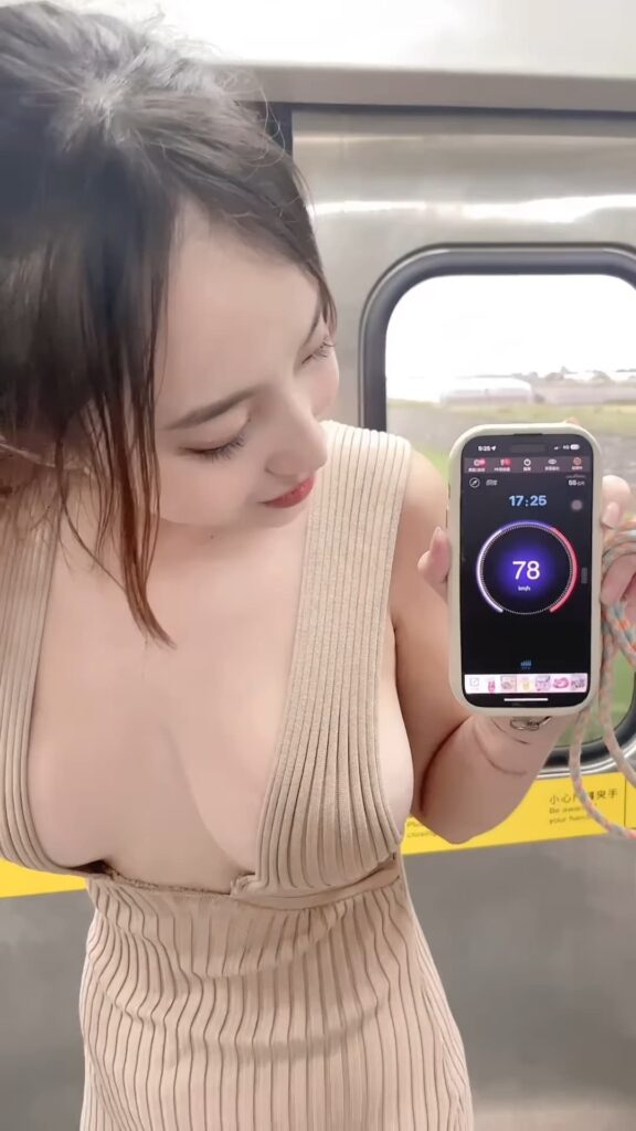 Commuter car: door-side hottie “Vina” in skin-tone plunging dress; thick straps barely contain. Train jolts → soft massive chest bounces hard. Phone app speed check? Eyes diverted—total hazard!