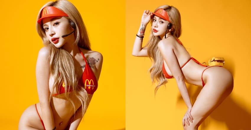 Weekend vibes! Treat yourself to a combo after a tough week—totally fair! This cashier is TOO spicy! Wendy Nanxiang rocks a red bikini + headset as a fast-food clerk, serving customers with boob hugs and using her perky butt as a tray!